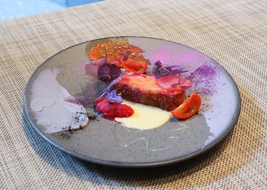 salmon cutlet cooked rare with grated daikon radish and saffron butter sauce