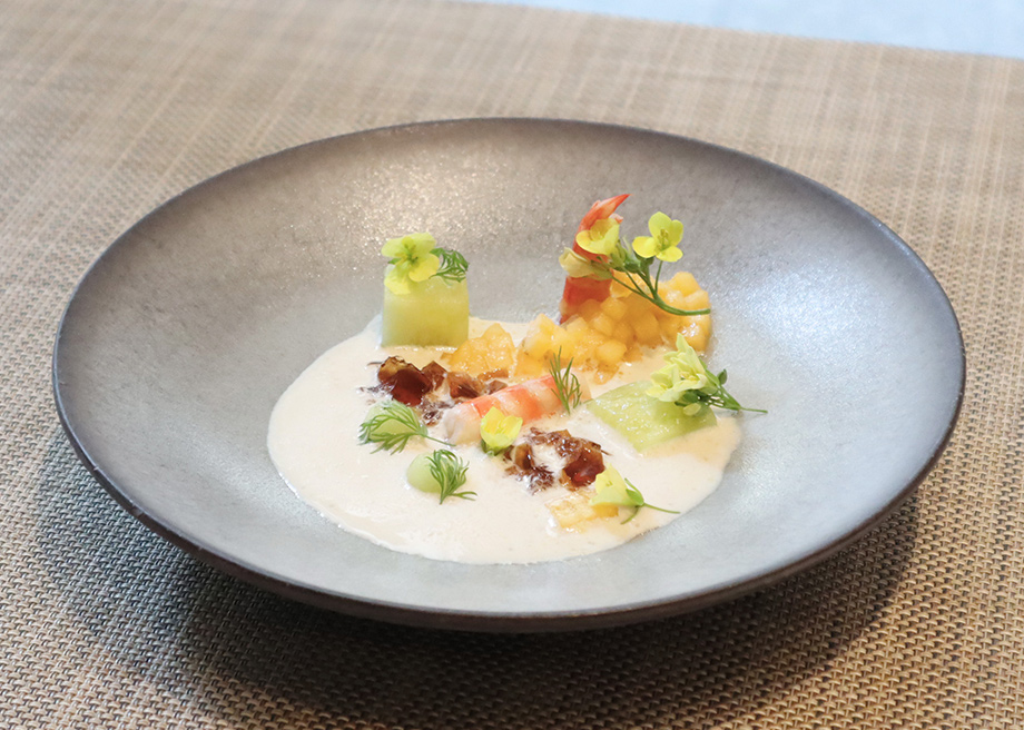 prawn and marinated fruits with lobster gelée and américaine cream