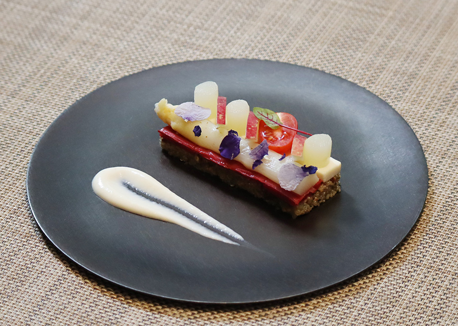 white asparagus and rhubarb on tabbouleh with grains