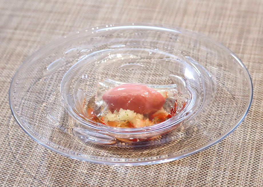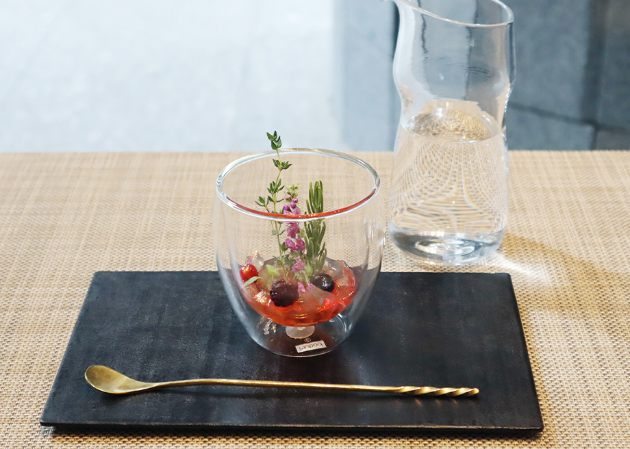 豆乳ヨーグルトに苺ピューレを加えて作ったアイスに、ポレンタのクランブルやバジルのジュレを合わせ、一口に異なる食感を味わえるヴェリーヌに仕立てました。