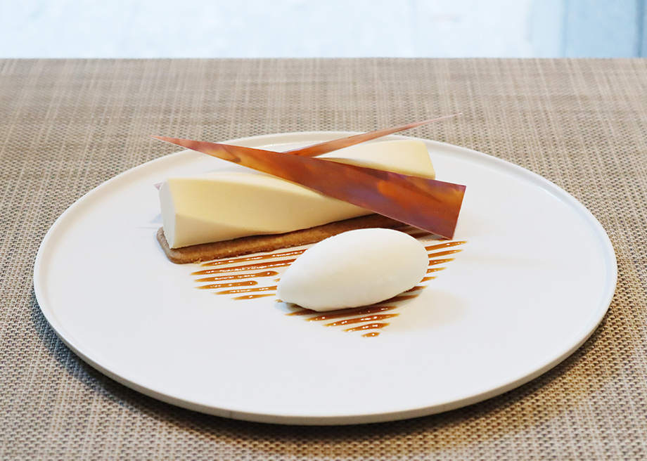 口当たりの軽いマスカルポーネムースの中に、カルダモン香るコーヒージュレ、食感あるクランブル、クレームエペスアイスを添えたデザートです。