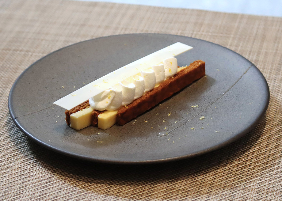ほろ苦く焼き上げたパイ生地に、爽やかな酸味を効かせたレモンのバタークリームを挟み、レモンソースとホワイトチョコレートの飾りを添えて仕上げました。
